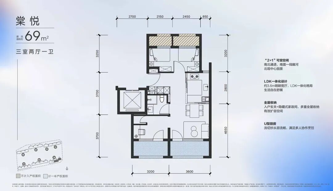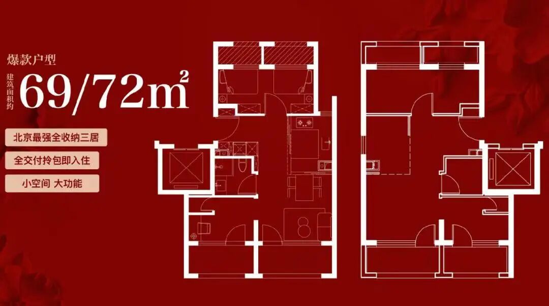 此前,北京三居的最小建面出现在顺义,青年ONE72㎡。朝棠揽阅则打破了前者的记录,做到了69㎡小三居。
